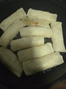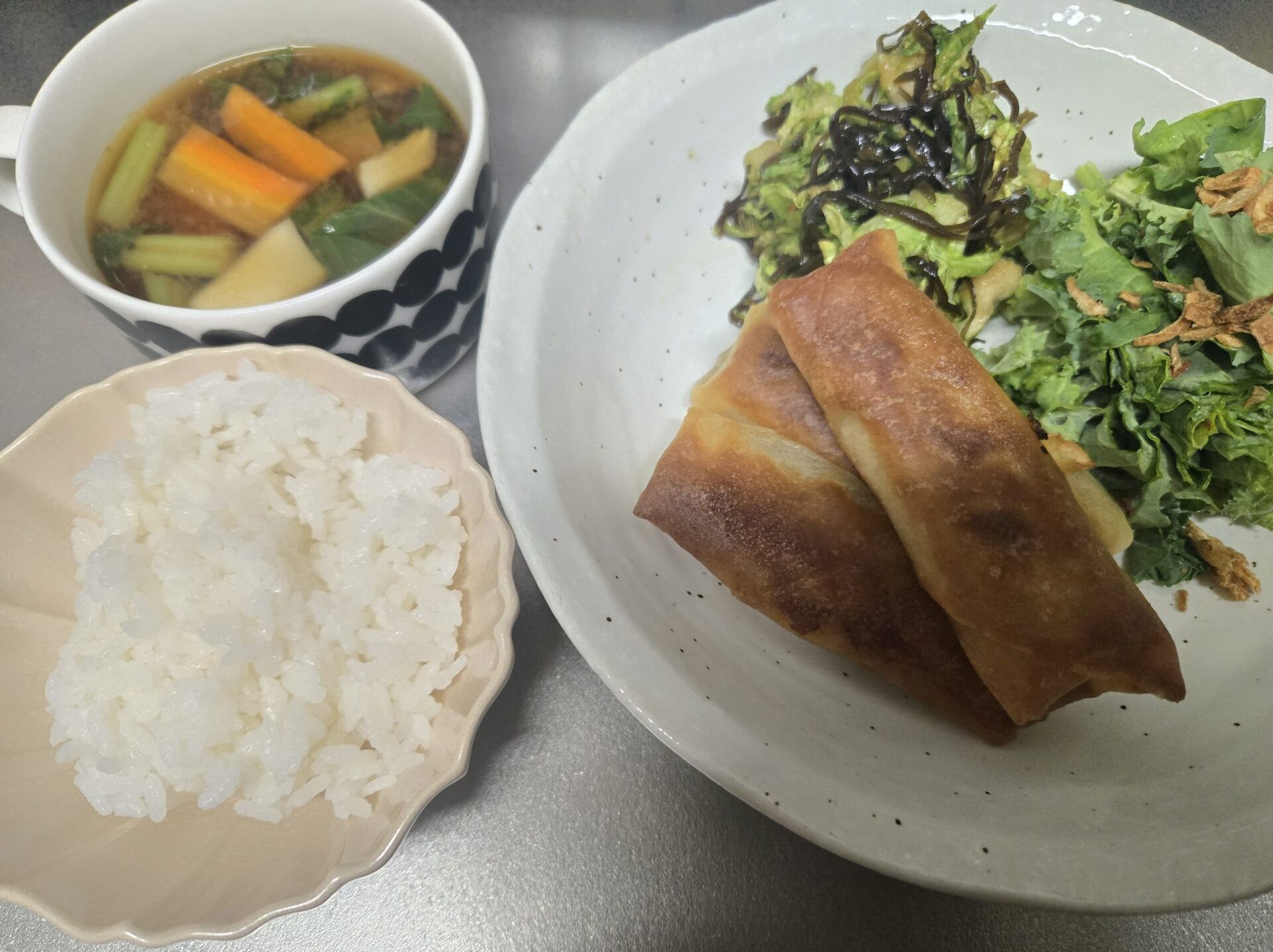→今日はお買い物に行く時間がなく、変則メニューにしました!冷凍庫に春巻きがあったのでそれを使いました。あとは昨日の残り物と、お味噌汁は今日のメニュー通り作りました。🤗