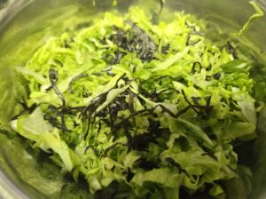 1. キャベツを細切りに、ラディッシュは薄切りにする。葉は刻んで入れてOK。塩昆布とまぜて放置。