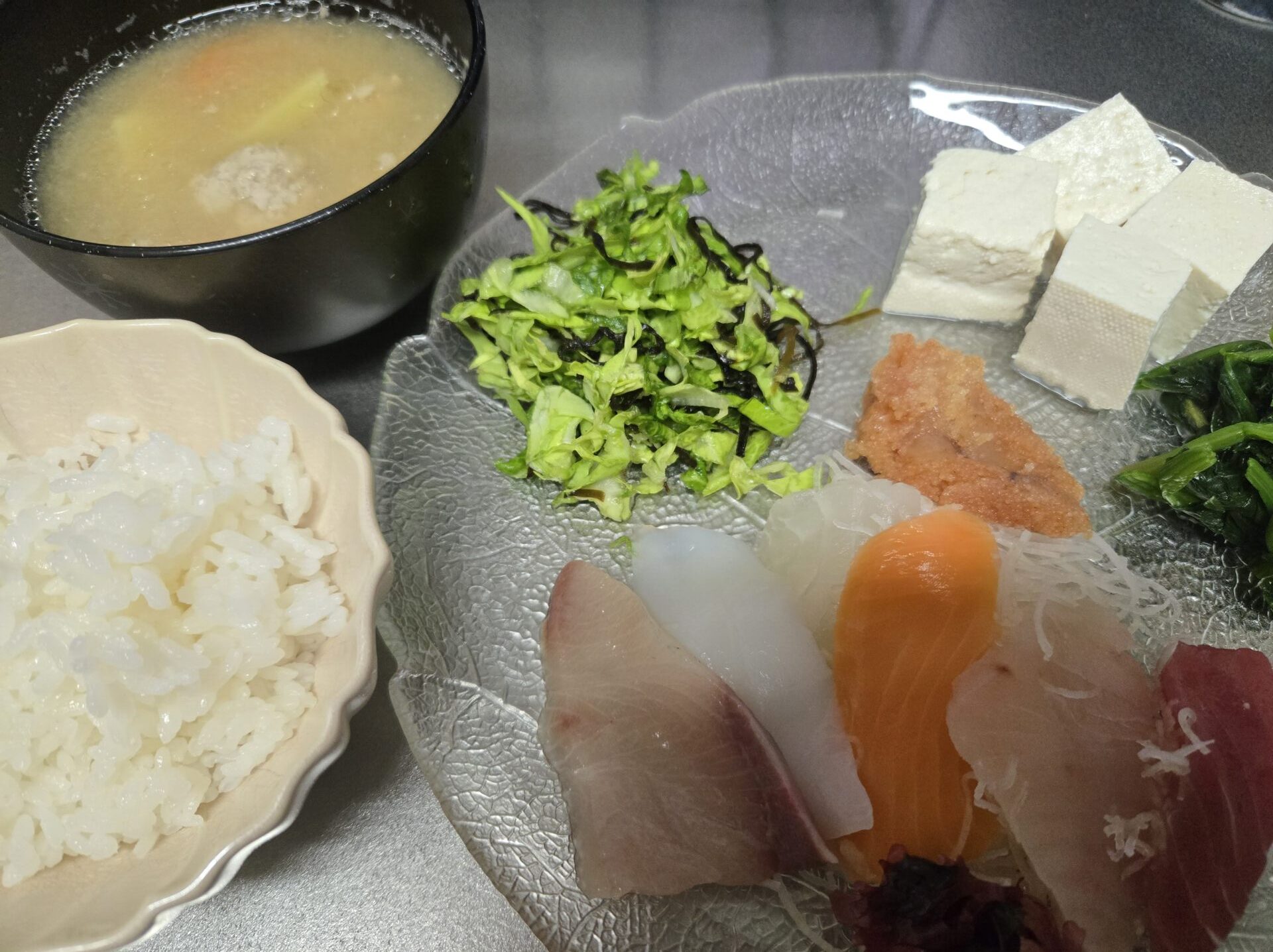 買い足しチェックリスト: お刺身(当日購入)、味噌、豆腐(お好みで)、塩昆布(冷蔵庫にあった)