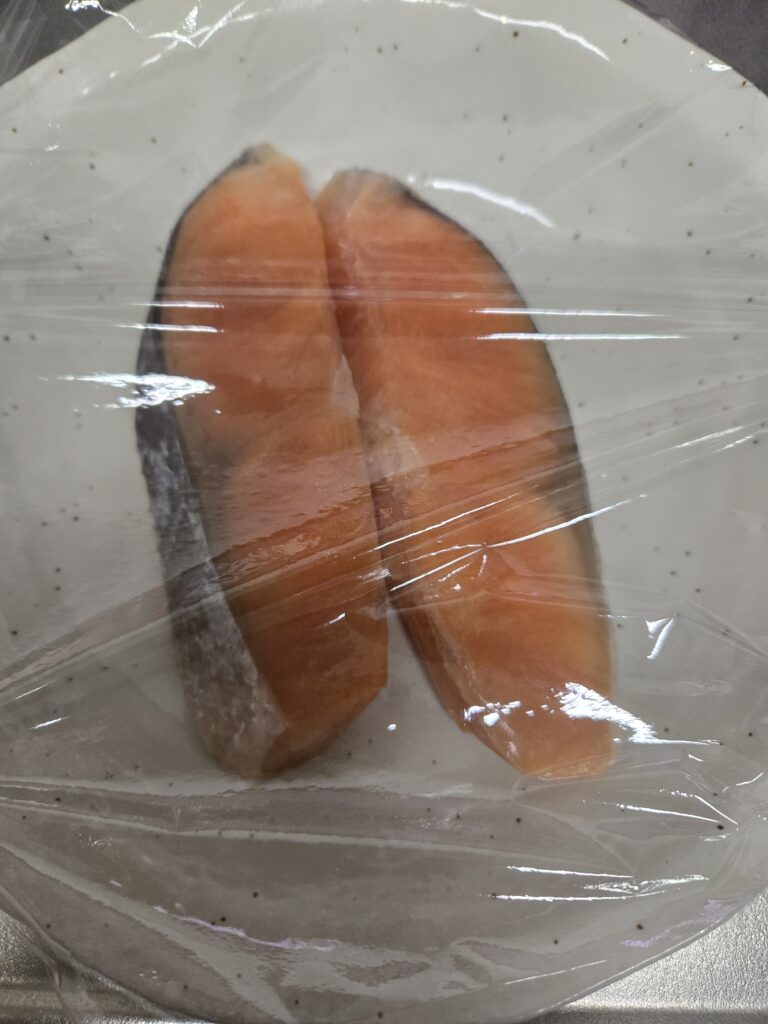 →冷凍のさけがあったため、そのままレンチン5分で加熱しちゃいました!