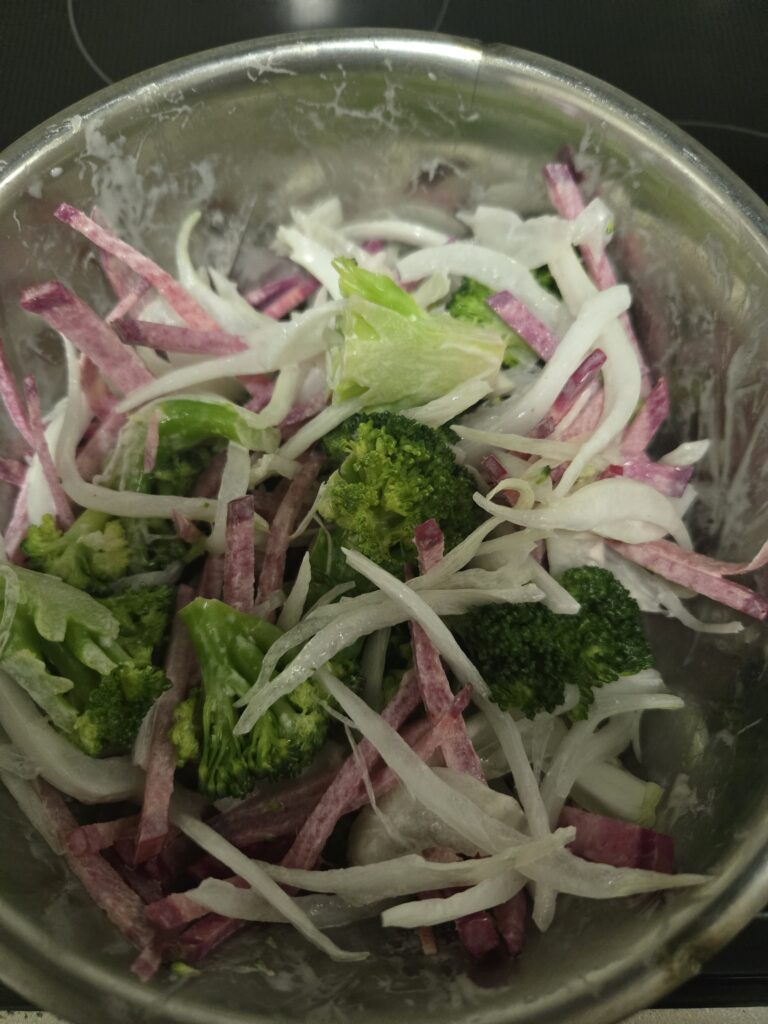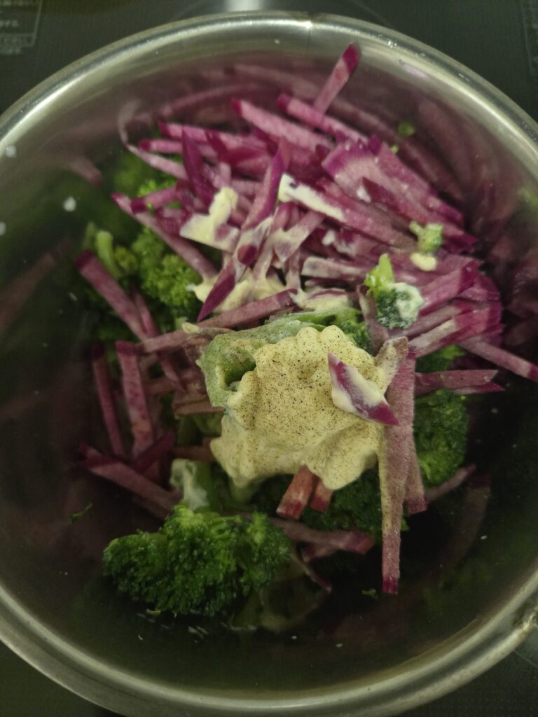 - 副菜:ブロッコリーとラディッシュのマヨサラダ(赤玉ねぎ入り)