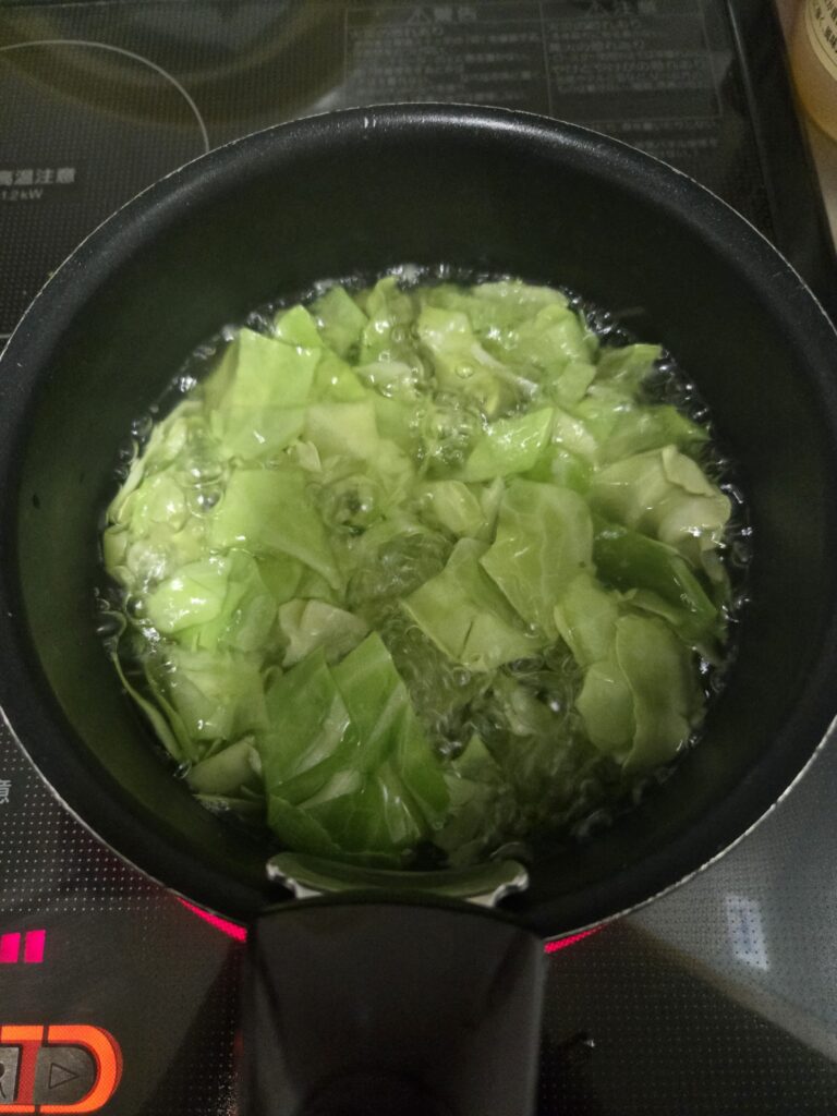 - 鍋に水600mlとだし顆粒を入れて加熱し、沸騰したらキャベツを入れます。